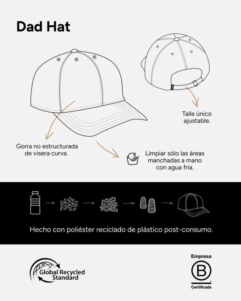 La tela y la visera están hechas con plástico reciclado post-consumo.